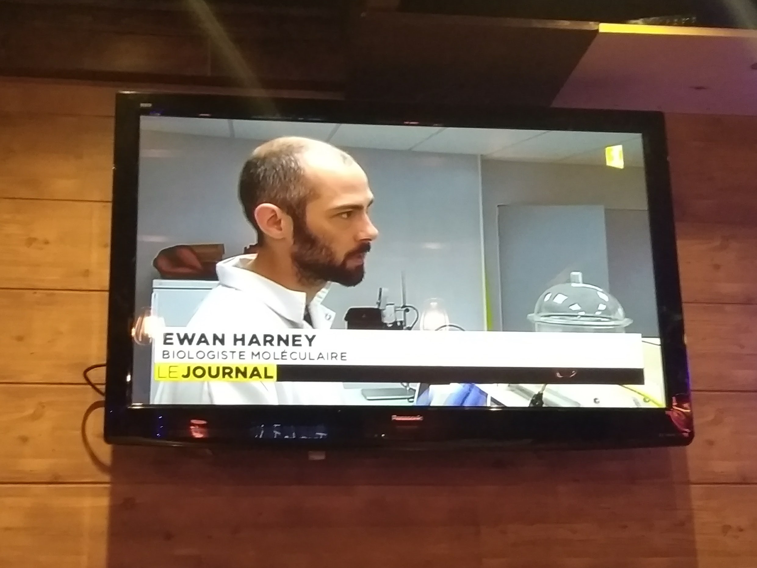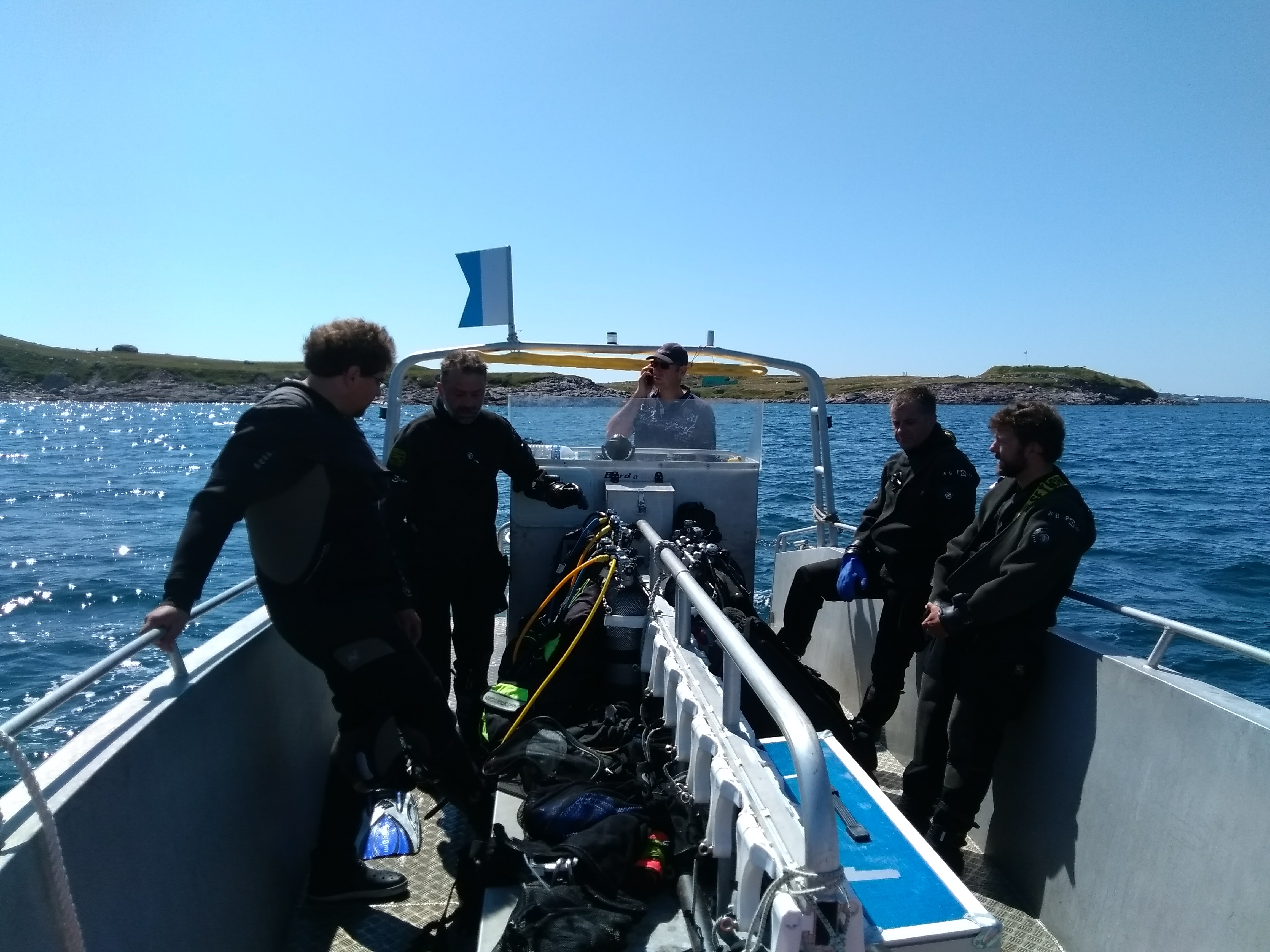 Clockwise from top left: the dive team ready to sample A. islandica at 30 metres depth; mobile lab set up on the dive boat; making it to the local news; P. magellanicus of various sizes; diving for P. magellanicus in Saint-Pierre harbour; searching for A. islandica at more than 50m depth